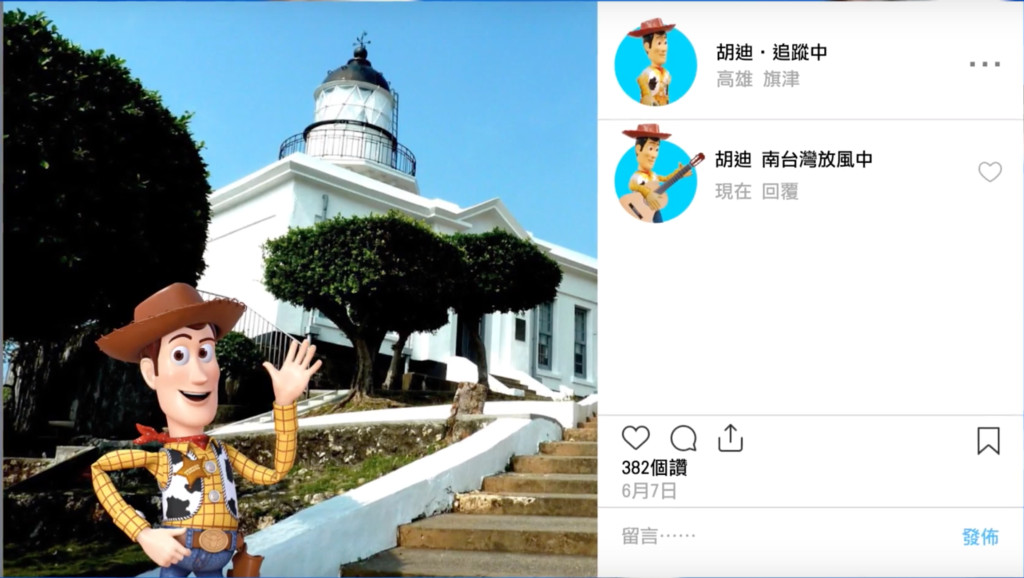 不過據網路民眾指出!在台北象山、士林夜市、南投日月潭、嘉義奮起湖、高雄旗津、屏東鵝鑾鼻等地都有胡的與玩具們自拍打卡的照片,影片中可以看見胡迪背對著台北101自拍,並在IG曬照寫下:「也許不斷流浪,只是為了找到安身立命的地方。」此時巴斯光年立刻嗆聲:「你媽知道在這裡發廢文嗎?」而抱抱龍也羨幕表示:「電影宣傳?去台灣喔?我也要去!」等字樣,足見他的超高人氣,特別是他到了高雄旗津曬照,並寫下:「南台灣放風中!」瞬間引發網友暴動:「高雄發大財!」。不過有眼尖的網友伴演鍵盤柯南的精神,發現了一些蛛絲馬跡,像是:很久不見的牧羊女,竟然在他的動態留言,甚至還有幾個新角色的照片,更讓網友們覺得:這個案情絕對不單純。