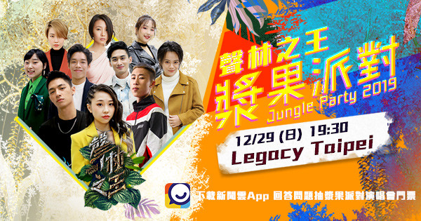 聲林之王「漿果派對」演唱會來囉!12月29日就在華山文創園區Legacy,平常只能透過電視或手機螢幕看聲林,12月29日通通搬上Legacy舞台,給你最近距離的聲林之王!漿果派對邀來李艾薇、艾文、吱吱、吳霏、楊碧琪、盧子杰、劉學甫、陳瑽、陳忻玥、陳央熱力開唱,現場還會有那些彩蛋嘉賓呢?現在只要下載新聞雲App或上聲林之王官方IG(帳號:junglevoice_ettoday),參加活動、回答問題就抽《漿果派對》演唱會門票!2019年末,快和聲林之王野獸們來一場狂歡派對!