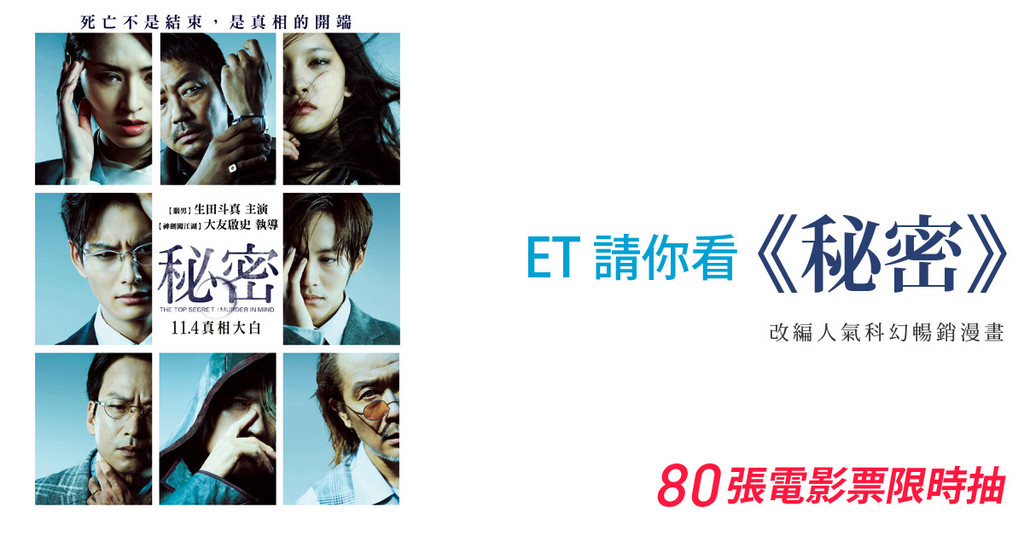 電影《秘密》由岡田將生與生田斗真主演,兩人暌違七年再度合作,共同破解懸案之謎!ETtoday要請你免費去看電影囉!現在只要下載《東森新聞雲APP》( 點我下載),就有機會獲得《秘密》特映券兩張!每人限領一份,共80張,數量有限、趕緊抽票去!劇情科幻卻不失真,快跟著他們一起去破案吧!