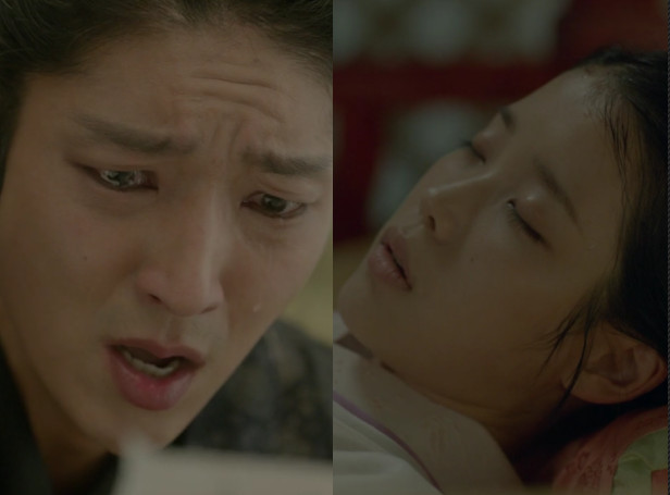 生重病又懷有身孕的IU用盡全身力氣生下與王昭的女兒,臨終前仍然沒等到摯愛,最後撒手人寰;王昭得知IU離世的消息,崩潰前往十四王子府邸,抱著骨灰痛哭,她雖留下一女,但兩人在古代以悲劇結尾。