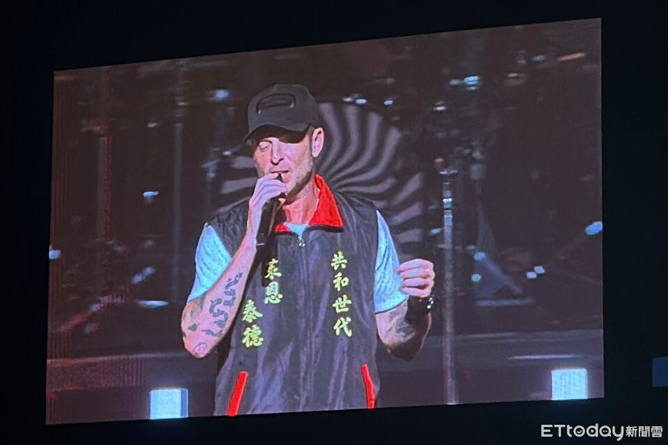 ▲OneRepublic穿上「宮廟背心」高雄開唱,主唱萊恩的名字還特別用了中文標楷體。(圖/讀者提供,請勿隨意翻拍,以免侵權。)