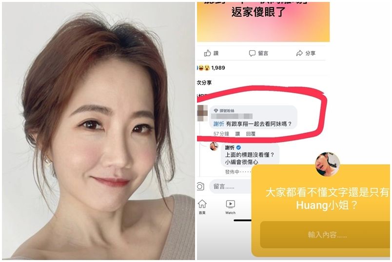 藝人謝忻曾跟阿翔有過一段不倫戀情,在道歉沉澱後選擇重新出發,即使還是常被社會大眾批評,也一一面對甚至反擊。近日阿翔去看阿妹演唱會的消息被報導,謝忻看到有網友留言酸她「有跟享翔一起去看阿妹嗎」,毫不客氣地截圖反嗆:「看不懂文字?」嗆辣態度也引來圍觀。