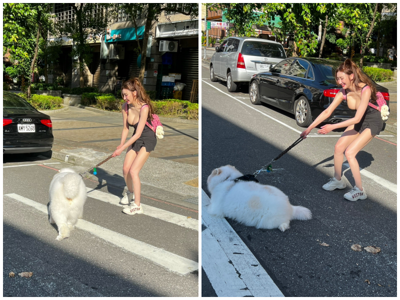 畫面中可見,一名牽著大狗的女主人,在斑馬線上與薩摩耶犬上演拔河戲碼,愛犬一下不肯走、一下又趴下來休息,讓女主人表情滿是苦笑,也因此被網友戲稱為「拔河妹」。不過看到女主人的火辣身材,也讓網友笑稱「地點呢」、「我可以為她等3個紅綠燈的時間」、「我可以幫妳拉」。