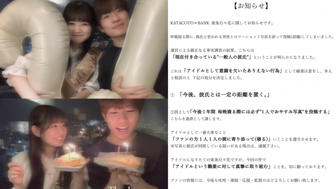 日本8人女團KATACOTO * BANK於2021年成軍,團體正處於上升期,成員東條百百花(Tojo Momoka)卻在26日手滑男友照,她與男友慶生的甜蜜約會畫面全部曝光,看得歌迷心碎不已,照片引起瘋傳。針對她的手滑行為,公司27日發布處罰條款,要求她「每天睡前回報晚安照」,試圖挽回粉絲的心。