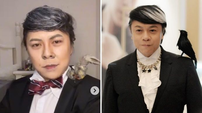 事實上,這是一位名為「冷漠女孩」的博主,為了仿妝蔡康永,她抓住了幾個特點,除了用成灰白色頭髮,眉型、眼下褶皺感、鼻樑挺度和輪廓線都仿得維妙維肖,肩膀還不忘放上有趣的小東西。