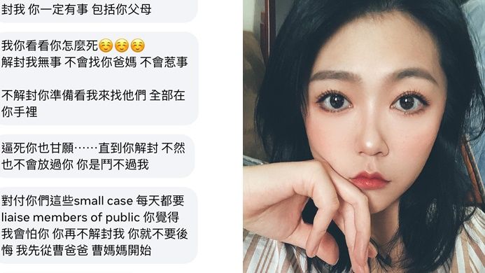 從曹雅雯蒐集的證據中,可以看到不明人士一直隔空放話:「這輩子不會放過妳」、「不解封我一定找妳」、「不解封就拿妳爸媽來行動」、「我會一直糾纏妳直到妳解封。」