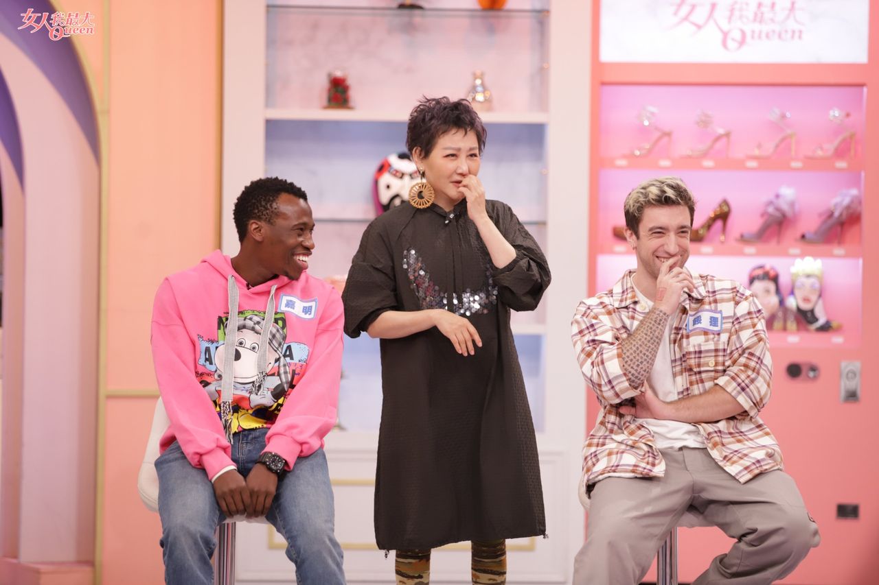 ▲藍心湄(中)和節目來賓嘉明(左)、餒狸被5位媽媽的少女心逗到樂不可支。(圖/TVBS)