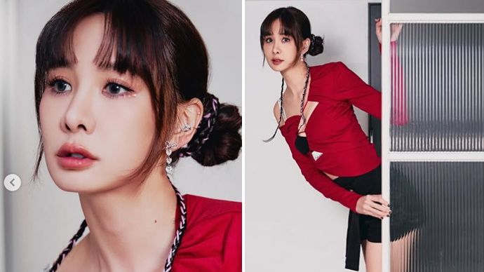 照片中,可以看到安心亞身穿紅色不對稱剪裁上衣,裸露肩部、加上正面挖了3個洞的設計,辣露內搭的黑色運動內衣,若隱若現出深邃事業線,展現性感又不失俐落的前衛感。
