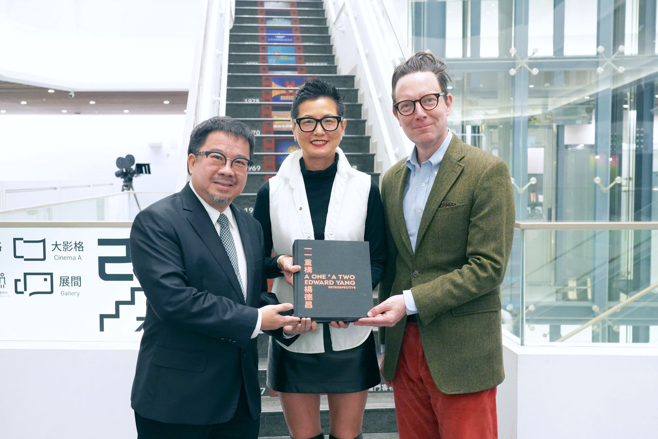 ▲(左起)影視聽中心董事長褚明仁、楊德昌遺孀彭鎧立、哈佛電影檔案館館長海登蓋斯特。(圖/國家影視聽中心提供)