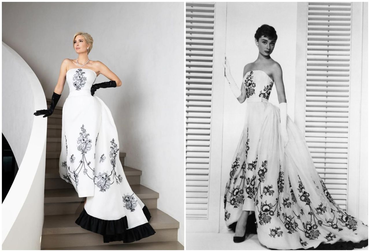 伊凡卡日前在就職舞會上,穿上紀梵希訂製禮服,這套無肩帶白色禮服以黑色花卉刺繡作點綴,長裙曳地,她將頭髮紮成髻,儼然重現赫本在1954年電影《龍鳳配》(Sabrina)中的經典造型。