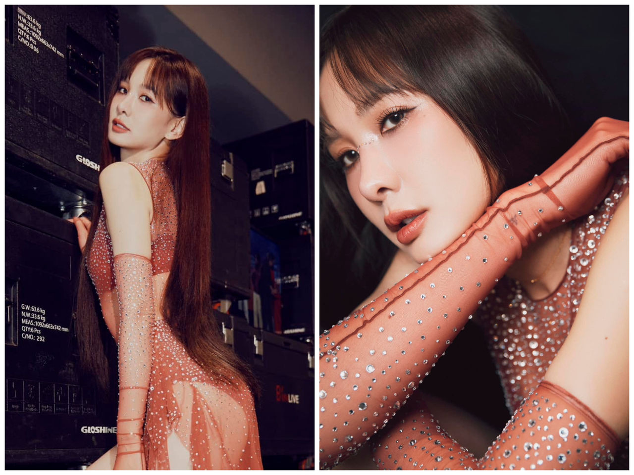 照片中,可以看到安心亞頂著一頭及臀長直髮,化上精緻妝容,身穿一襲紅色透視罩衫,相當映襯她的白皙肌膚,上頭鑲的碎鑽十分適合登台表演的她,若隱若現出內搭的內衣褲,渾圓半球、穠纖合度的雙腿線條全被看光,一轉側身更火辣露出蜜桃臀型!