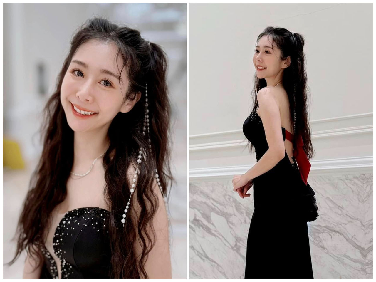 照片中,可以看到Albee頂著俏麗長捲髮,化上精緻妝容,身穿黑色禮服相當映襯她的白皙肌膚之外,胸前深V、薄紗設計若隱若現出渾圓半球,深邃事業線被看光。一轉身,她背後只繫著一條紅色綁帶,大片美背幾乎全外露,展現恰到好處的性感。