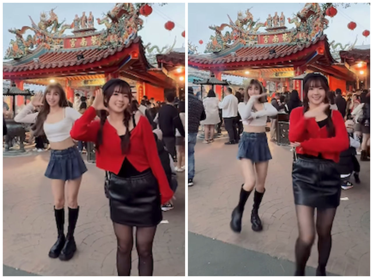 ▲笑笑穿著黑絲襪在紫南宮前辣舞。(圖/翻攝自Instagram/yuyu__liu)