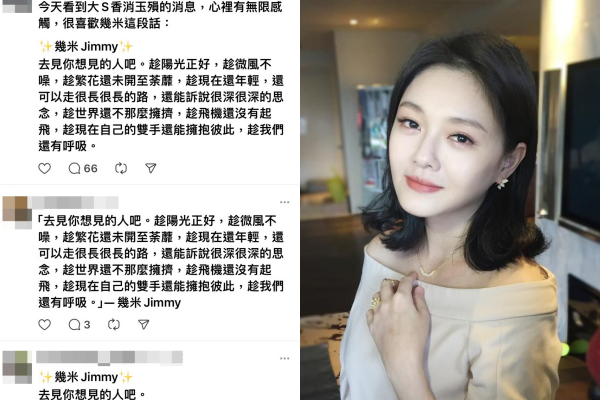大S離世的消息傳出後,讓許多台灣民眾都相當惋惜,網友紛紛在Threads上轉發一段作家幾米的語錄「去見你想見的人吧。趁陽光正好,趁微風不噪,趁繁花還未開至荼蘼,趁現在還年輕,還可以走很長很長的路,還能訴說很深很深的思念,趁世界還不那麼擁擠,趁飛機還沒有起飛,趁現在自己的雙手還能擁抱彼此,趁我們還有呼吸。」