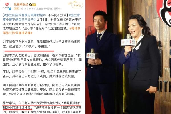此前,抖音官方8日宣布無限期封禁母子倆的帳號,「有部分帳號借機炒作,發布謠言,違背公序良俗和道德底線,不尊重逝者及家屬,也傷害了公眾感情。對此類行為,我們堅決予以打擊。」內容點名張蘭的帳號「張蘭·俏生活」、「張蘭之箖玥甄選」以及「汪小菲」,抨擊兩人在大S離世後炒作,「因利用徐熙媛離世事件進行商業炒作,持續發布不實內容、違規推廣影片並牟取利益,儘管此前已遭處罰,仍未改正,因此同樣遭到無限期封鎖。」