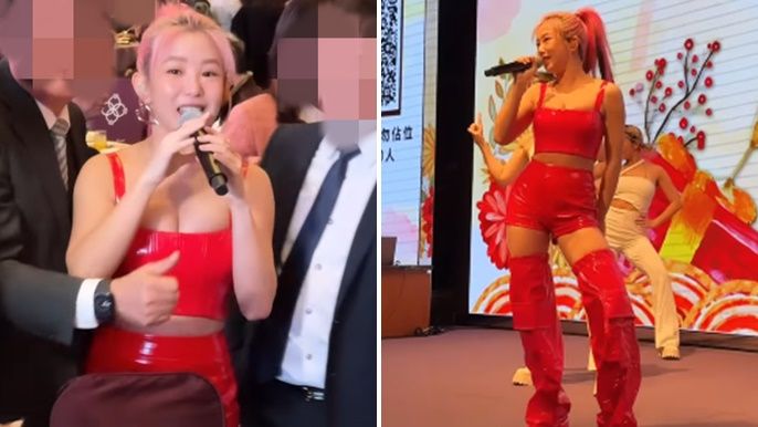 郭書瑤下半身搭配紅色高腰激短褲,自信秀出絕對領域,在台上唱跳舞曲時氣場全開;不只這樣,她還一路唱到台下,還員工近距離合照,展現親民的一面。