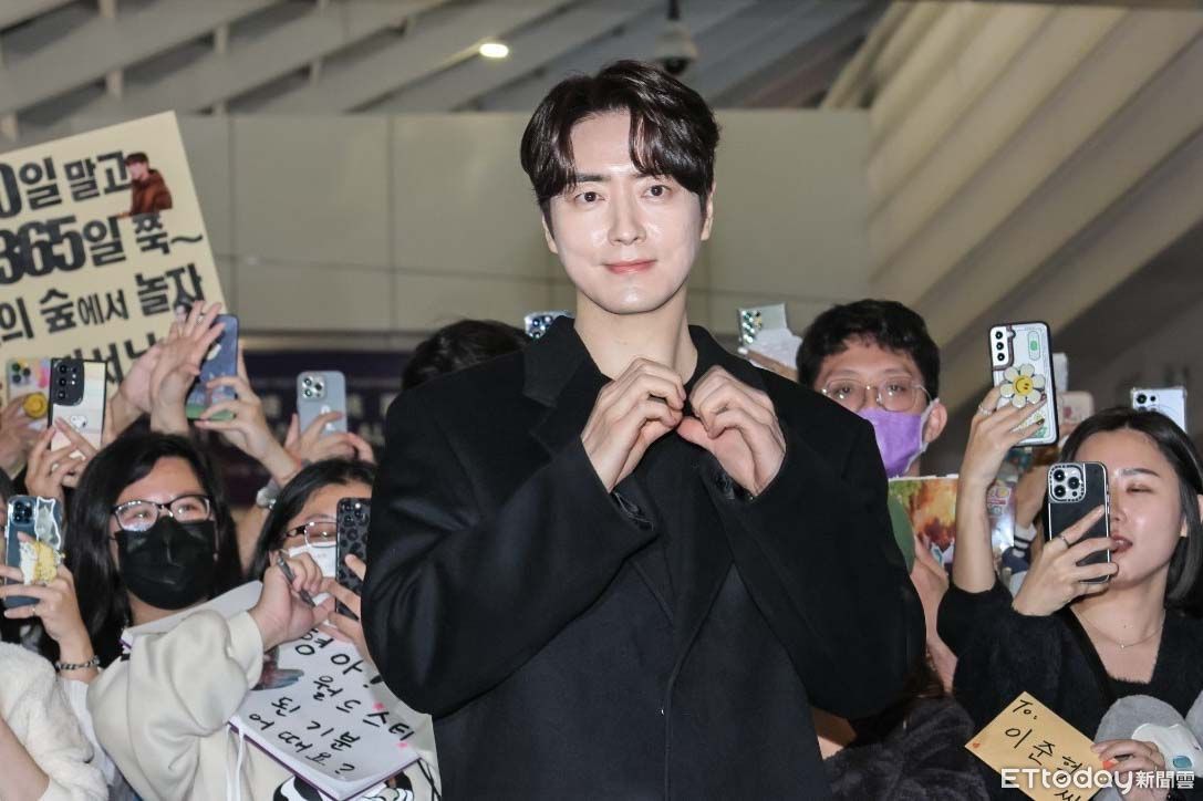 而李浚赫今天穿著一身黑,帥氣現身第一航廈出境大廳,現場500多人的尖叫聲瞬間轟炸現場,他也溫柔地幫粉絲簽名、玩自拍,幾乎來者不拒,相當親切又親民,總計在現場停留約5分鐘。