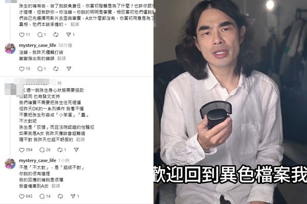 網紅孫生性騷案引起軒然大波,為此遭老闆酷炫解約切割,YouTuber「異色檔案DK」也出面開轟,孫生因此出現輕生念頭,讓DK自責表示「他離世,我害的,我會離世,所以負責到底。」所幸沉澱了一天後,DK道歉「我昨天聖母病發作,我現在完全清醒了」,19日下午他陸續在社群上查看網友建議,自認「我的回應的確就是很爛」。