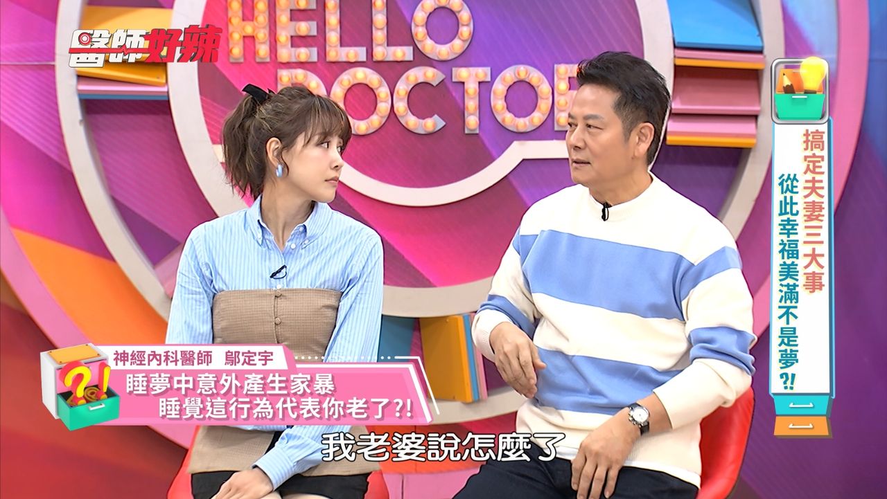 東森綜合《醫師好辣》由徐乃麟、嚴立婷攜手主持,邀請馬力歐、李新、靜香,大聊夫妻生活中的私密煩惱。節目中,徐乃麟竟自爆:「我老婆說我半夜睡到一半,突然對她揮拳。」神經內科醫師警告,這恐怕是神經退化性疾病的警訊,如帕金森氏症、失智症等。嚇得徐乃麟急忙否認:「我沒有這些疾病!這段給我剪掉!」逗趣反應笑翻全場。