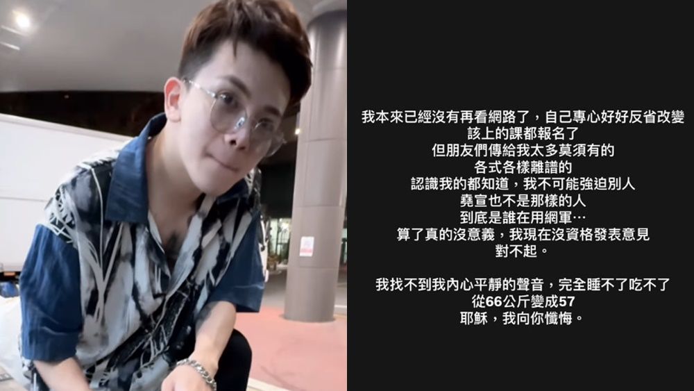 我本來已經沒有在看網路了,自己專心好好反省改變,該上個課都報名了,但朋友們傳給我太多莫須有的,各式各樣離譜的。認識我的都知道,我不可能強迫別人,堯宣也不是那樣的人,到底是誰在用網軍,算了真的沒意義,我現在沒資格發表意見,對不起。我找不到我內心平靜的聲音,完全睡不了吃不下,從66公斤變成57。耶穌,我向你懺悔。