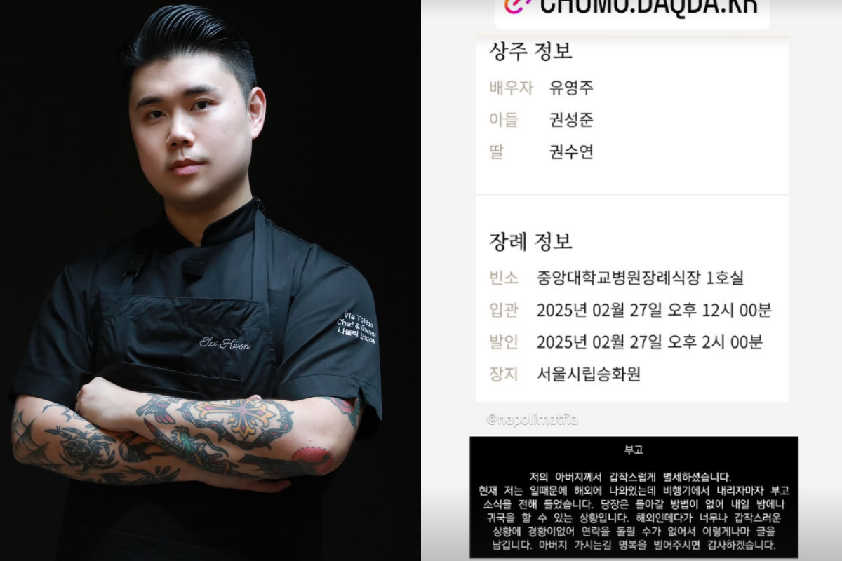 權聖晙主廚在Instagram限時動態中,附上了一篇訃聞,透露父親突然去世的消息。他提到,自己目前因為工作的關係,人在海外,一下飛機就得知了父親的死訊,「但現在暫時沒有辦法立刻返國,最快也要等到明天晚上才能回去。」
