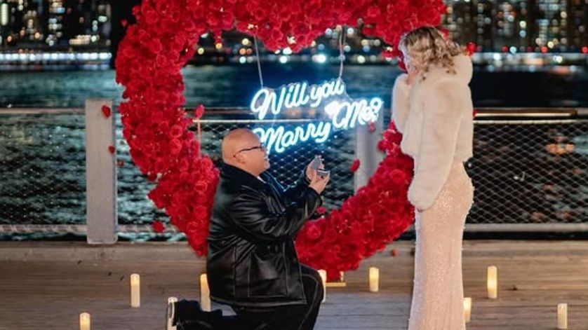 照片中,雅各布貝塔隆精心策劃了一場夢幻求婚,選擇在紐約擺放了一個由鮮紅玫瑰組成的心形裝飾,並在中央點綴著「Will You Marry Me?」的霓虹燈字樣,浪漫氛圍滿溢。當晚,他身穿黑色皮衣,單膝下跪向女友遞上訂婚鑽戒,女方則穿著一襲閃耀晚禮服、驚喜捂嘴,幸福瞬間被完美捕捉。