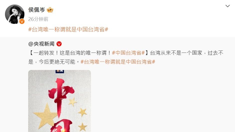 大陸兩會重頭戲7日登場,中國外交部長王毅被問及台灣主權問題時回應,「台灣地區在聯合國的唯一稱謂就是中國台灣省。」言論成為微博熱門關鍵字,上百名大陸藝人轉發央視貼文,其中侯佩岑也轉發該篇文章寫下「台灣唯一稱謂就是中國台灣省」,成為第1位發文的台灣藝人。