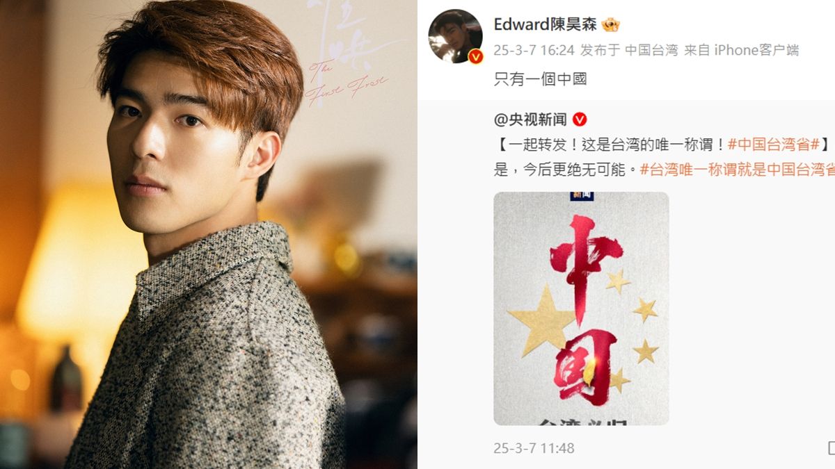 藝人陳昊森2019年以《刻在你心底的名字》爆紅,後續演過多部戲劇電影,2022年底簽約壹心娛樂發展大陸事業,近期在熱門劇《難哄》中飾演男二蘇浩安,廣受歡迎,而他7日也跟進轉發央視貼文,直呼:「只有一個中國。」
