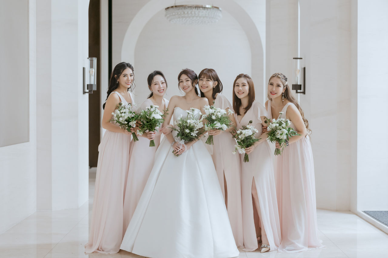 ▲勇兔、王宇婕、林萱瑜、黃郁涵、Rara擔任曾智希的伴娘。(圖/記者周宸亘攝)