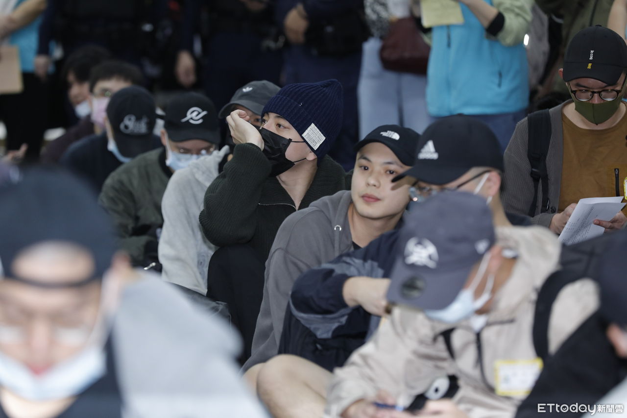 ▲王大陸現身北車,和其他役男一起乖乖坐地上。(圖/記者湯興漢攝)