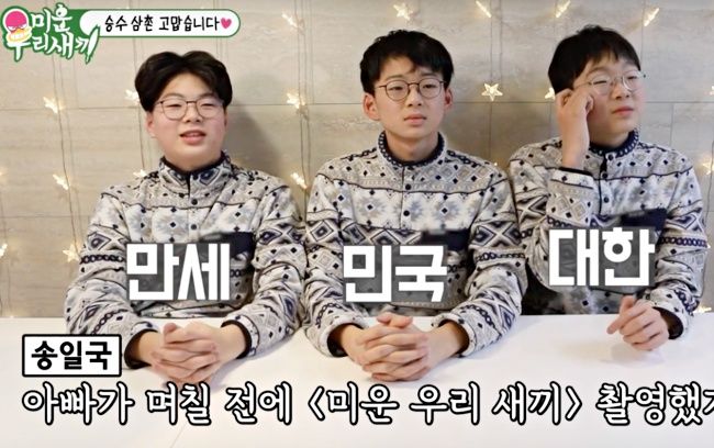 親媽、親爸粉們注意,三胞胎近況再更新!韓國代表性親子綜藝節目《超人回來了》中的元祖家庭,演員宋一國一家,在2014年帶著自家寶寶大韓、民國、萬歲出演節目,超萌外表、3人3色的個性加上古靈精怪的互動一夕爆紅,受封「國民三胞胎」,不過3位小可愛早已長成少年,在今年上國中一年級啦!