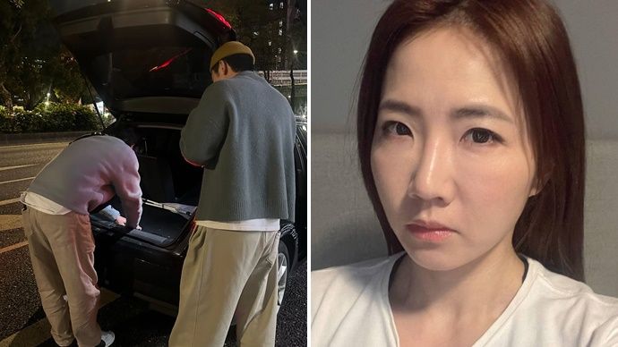 照片中,可以看到兩名男子站在黑色車子後方,打開後車廂查看。對此,謝忻幽默地說:「他們不是在偷車是在找三角架。」