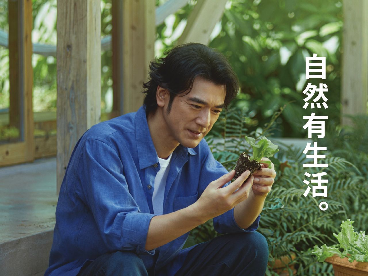 最新公開的兩張照片中,金城武身穿一件深藍色漢麻襯衫,內搭白色T恤,搭配深色長褲與白色帆布鞋,眼睛專注地端詳手中一株新移植的小植栽,臉上露出溫和而專注的神情。另一張照片則是身穿一襲白色襯衫搭配米色休閒長褲與白色球鞋,單手牽著一台配有前置籃的單車,漫步在被青草包圍的鄉間小路上。兩張照片都充滿自然綠意氛圍,加上照片都有「2025漢麻」,外界推測他代言品牌的春夏服飾系列。