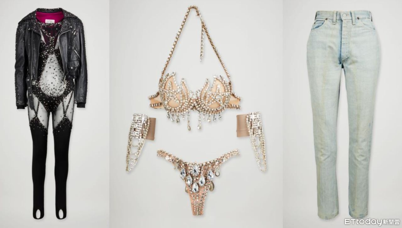 ▲左:雪兒(Cher )2002 年演唱 If I Could Turn Back Time在舞臺穿著由鮑勃·麥基 (Bob Mackie) 設計的服裝。中: 布蘭妮·斯皮爾斯(Britney Spears ) 2001 年穿著鮑勃·麥基設計的法國金屬線工藝《Jubilee》表演套裝。右:瑪麗蓮·夢露 1954 年《大江東去》中的牛仔褲(來自 Dee and Tommy Hilfiger 私人收藏)。(圖/朱利安拍賣行提供)