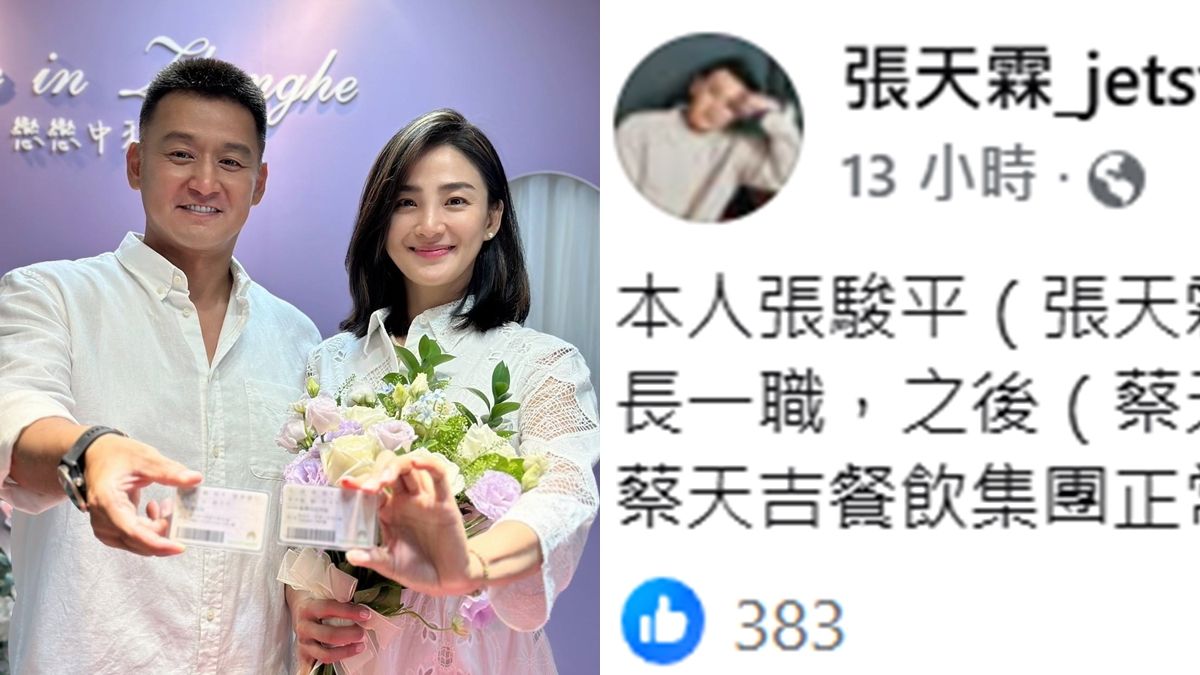 張天霖4日兒童節與太太洪小鈴共同宣布愛女「張小妹」報到,沉浸在新手爸媽的幸福之中,未料昨晚(4月10日)突然在粉專發出聲明,宣布退出自任董事長的品牌「蔡天吉餐飲股份有限公司」,並已卸下董事長職務,消息一出令粉絲震驚。
