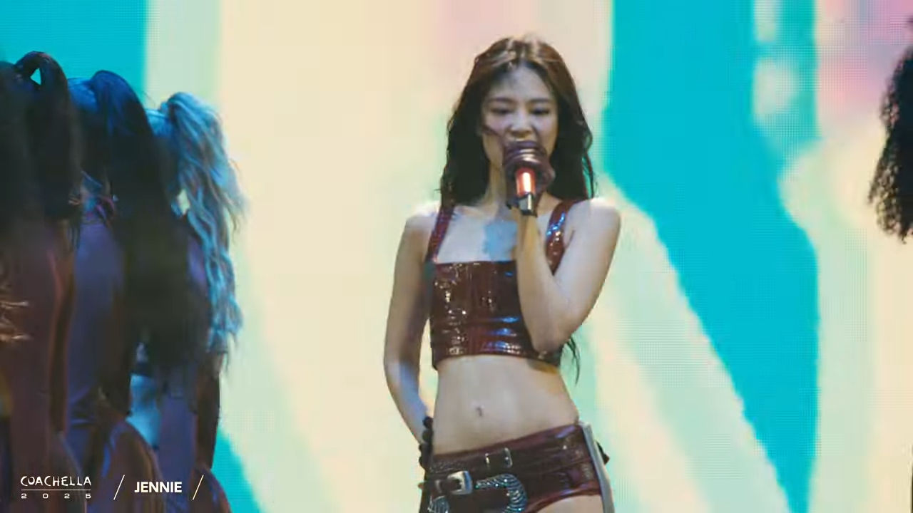 Jennie以solo之姿來到科切拉舞台,她戴上牛仔帽、披著皮外套霸氣現身,隨後把外套與帽子脫掉,兩截式的超短上衣與褲子,秀出一截火辣纖腰,隨著歌曲節奏熱舞扭腰,看得全場直呼「辣爆了」、「表演超殺」。