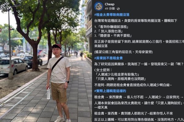 百萬粉絲網紅Cheap 14日在臉書針對「租金太貴導致商圈沒落」的議題發表個人看法,點出台灣許多商圈衰敗背後的深層問題。他直言,不少店面在房東貪婪調漲租金後,雖然短期內看似賺錢,最後卻落得長期空租,導致整體商圈活力漸失,連人潮也不復以往。