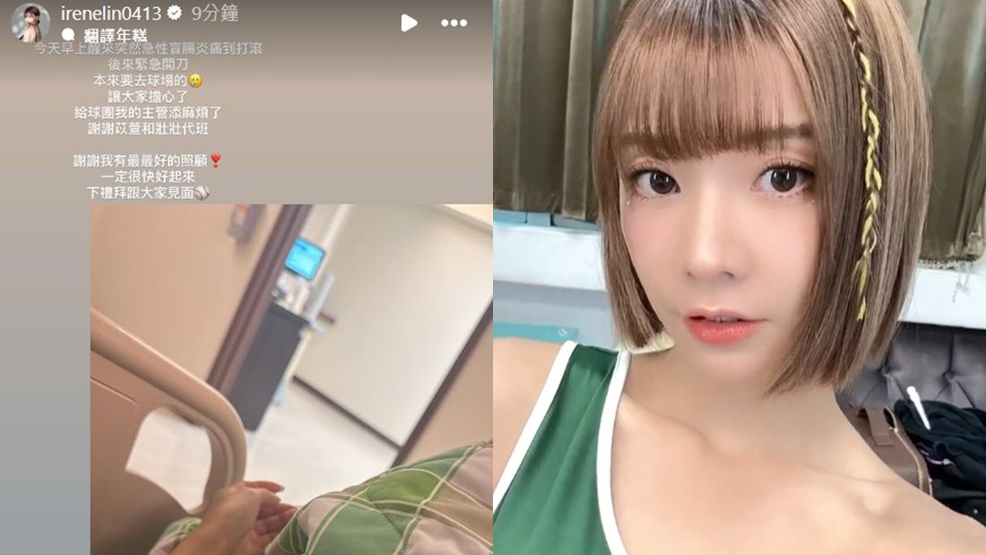 「中職最正MC」艾融除了是樂天桃猿的MC,同時也是職籃啦啦隊慕獅女孩的一員。平時會透過社群記錄生活的她,今(19)日突然在IG限動曬出一張躺在病床上的照片,透露自己因急性盲腸炎而入院開刀,「一定很快好起來,下禮拜跟大家見面。」