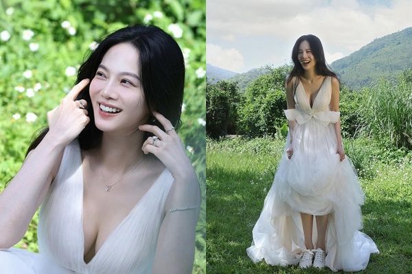 曾之喬曬出的美照中,她放下一頭黑色長髮,穿著一襲無袖白紗禮服,散發出優雅氣質。她站在綠色草地上,露出鎖骨與肩頸線條,胸前採用深V設計,大方露出事業線,畫面十分吸睛。