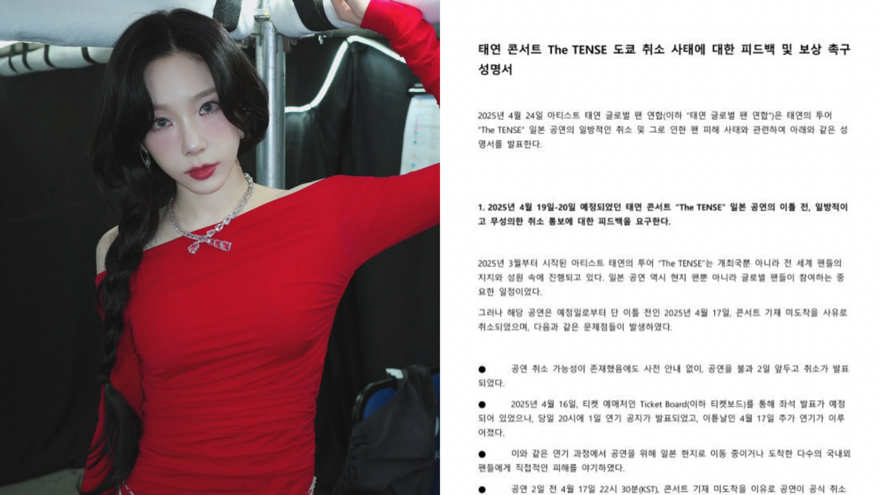 南韓人氣女歌手泰妍(太妍)日前原訂前往東京舉辦巡演,怎料,設備沒有辦法抵達當地,使得演出最終被迫取消,大批歌迷買了機票撲空,令粉絲欲哭無淚。而她在了解原委後,同步在IG表達對於粉絲的心疼之情,只是面對公司並未妥善處理後續,她最終在24日不忍了,同步貼出來自全球粉絲聯合應援會的5大訴求,就是要公司SM娛樂正式問題,讓SONE(粉絲名稱)淚崩直呼沒愛錯人。