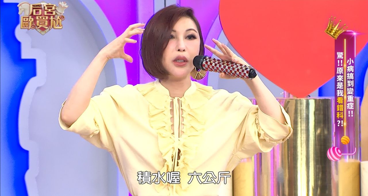 「犀利天后」利菁與「荒謬大師」沈玉琳聯手主持的東森超視《后宮歐買尬》,今天晚間九點將播出最新一集,邀請黃志瑋、倪雅倫、王嫚萱、胡文英、珮薰等藝人,分享生病選錯科的慘痛經驗。利菁率先爆料,日前因病告假錄影,自爆看病全過程,「一開始先去看胸腔科照X光,吃了藥卻毫無起色,感冒拖了一個月以上,才改看耳鼻喉科。沒想到醫生先施打類固醇,再開三餐各一顆的類固醇,短短三天,竟讓我全身水腫,從腳跟、脖子到嘴唇都腫脹,整個人胖了六公斤!」