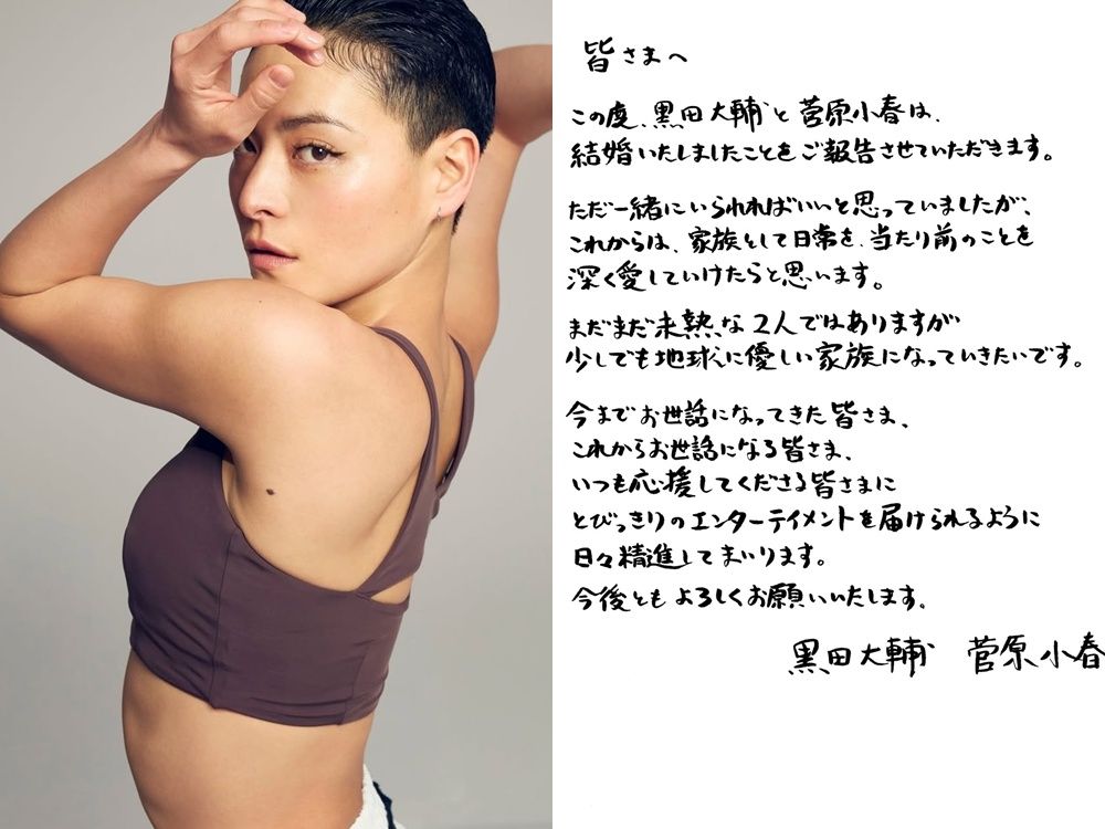 菅原小春與黑田大輔共同發表婚訊,宣布已經結婚的好消息,結婚聲明以書法字寫下,文中寫道「原本只要在一起就覺得很好,但希望從今以後,能作為家人深愛著日常和理所當然的事物。儘管我們處事還不夠成熟,但希望能成為對地球友善的家庭……。」