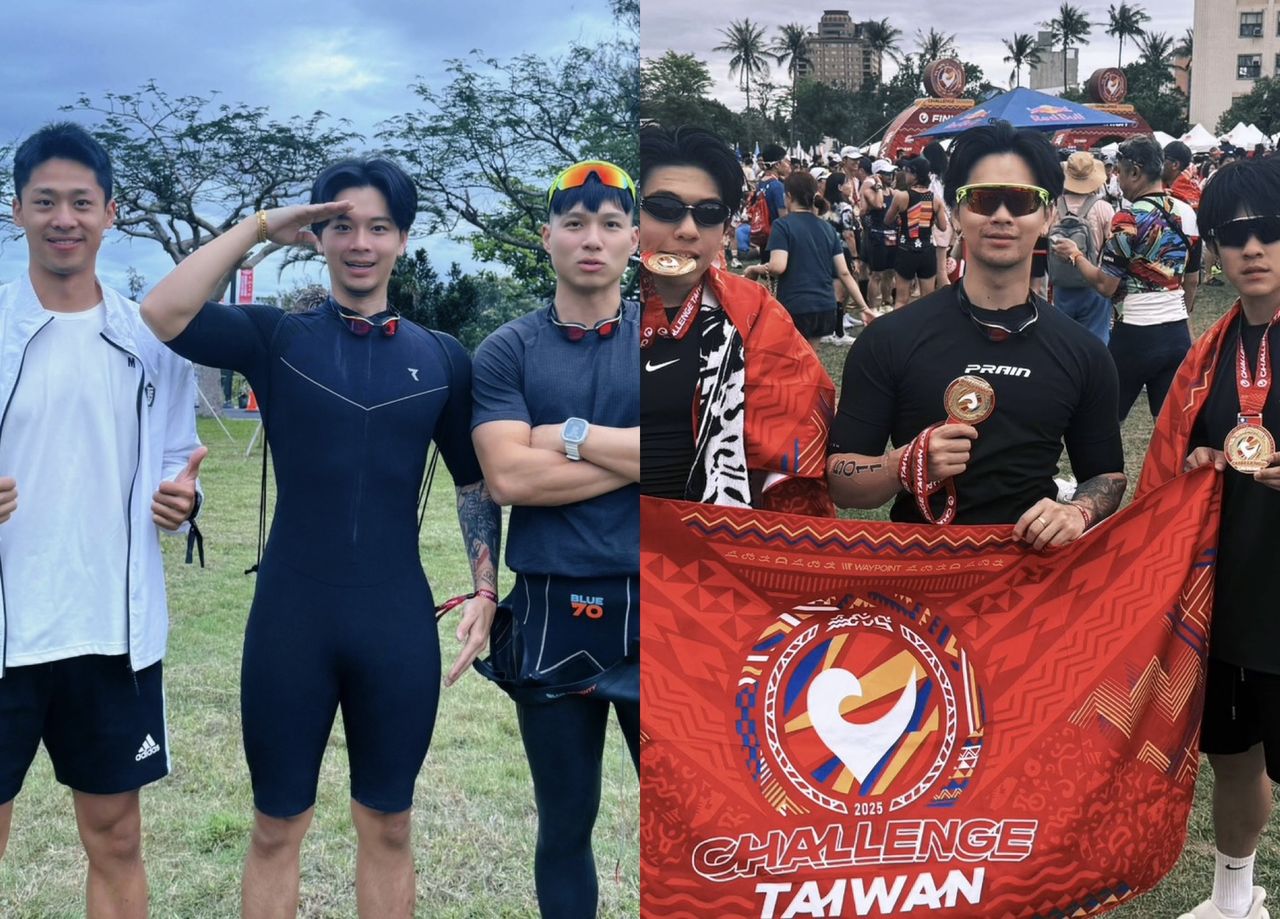▲▼高爾宣帶領公司員工及PIZZALI、王ADEN、林可綸參加鐵人三項比賽,還向「台灣蛙王」蔡秉融(下圖左)請益。(圖/龍大謝提供)