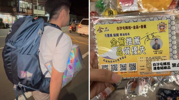 香蕉(王俊傑)最近和老婆一起踏上白沙屯拱天宮媽祖的進香之旅,行進的同時,他不忘送出結緣貼布,原本以為背包的重量會因此大幅減輕,「但大錯特錯了!」