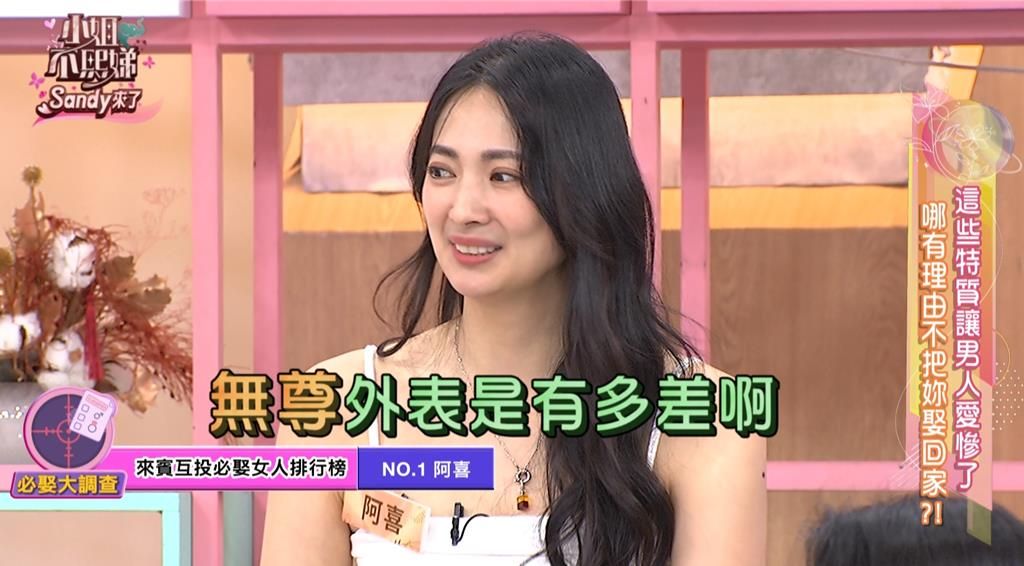 值得一提的是,女星互投排行榜必娶女人第一名是「阿喜」,因為大家一致認為她有鄰家女孩、賢妻良母的樣子,「不看對方錢財和外貌」,很注重內涵,聽到這裡于美人也忍不住發問:「無尊外表是有多差啊!」頓時換來全場一陣窸窸窣窣的說:「你去看你去看」、「美人姊妳近看一下」笑翻全場,讓阿喜相當無奈!