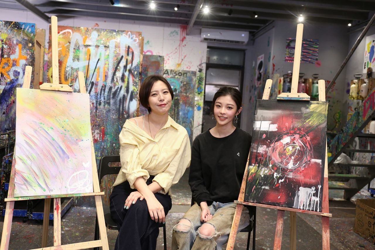 ▲劉品言(左)與詹子萱首次挑戰潑畫。(圖/鏡電視)
