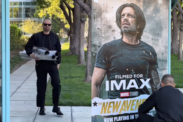 ▲賽巴斯汀史坦都現身街頭換海報。(圖/漫威提供)