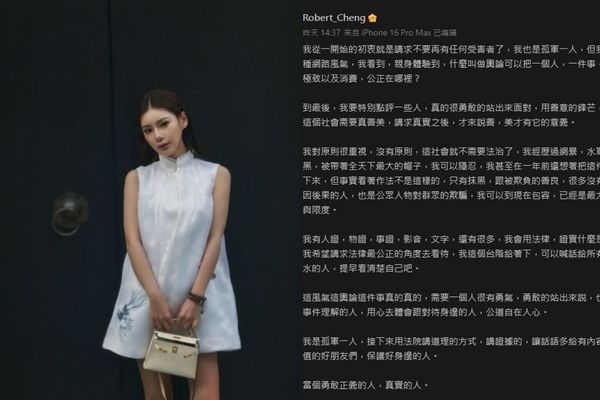 Robert於12日發文,強調此次發聲並非為了報復,而是希望阻止更多人受害。他坦言,「我從一開始的初衷就是講求不要再有任何受害者了」,也提到自己是「孤軍一人」,沒有任何助力,並表示最近經歷的事情,讓他體會到「什麼叫做輿論可以把一個人,一件事,抹黑成極致以及消費,公正在哪裡?」