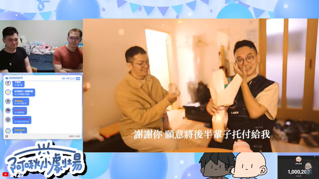 圖文作家阿啾從2007年開始在網路創作,後來與「學長」一同經營YouTube頻道,於14日迎來百萬訂閱。他為了慶祝百萬訂閱,稍早開直播和粉絲進行Q&A,同時也公開向學長求婚,引大票網友祝福。