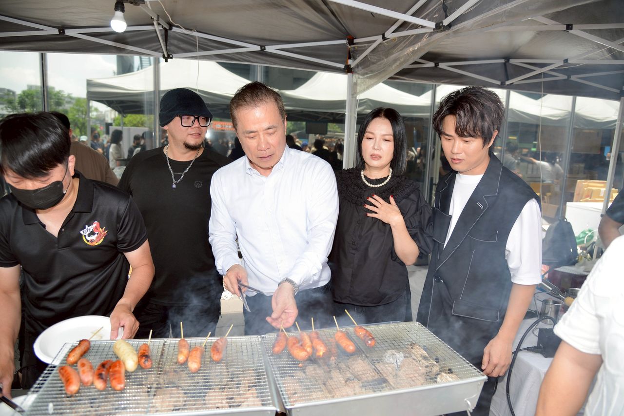 今在《阿姐萬歲》錄影前,主持人苗可麗與陳孟賢也趁企業日熱鬧氣氛,特地逛起各式美食攤位,並走訪《我們這一攤2》的刈包與香腸攤。現場擠滿員工,正好三立董事長張榮華也在場,三人熱情合體,現場即興「招客」賣香腸,氣氛相當熱絡。